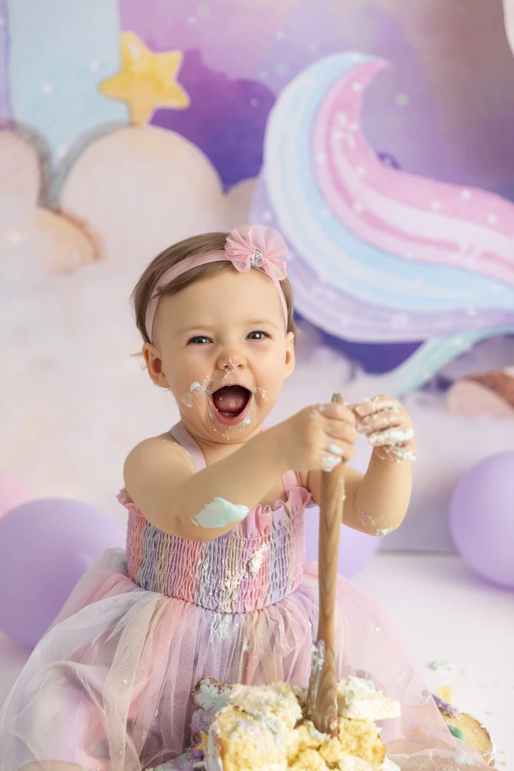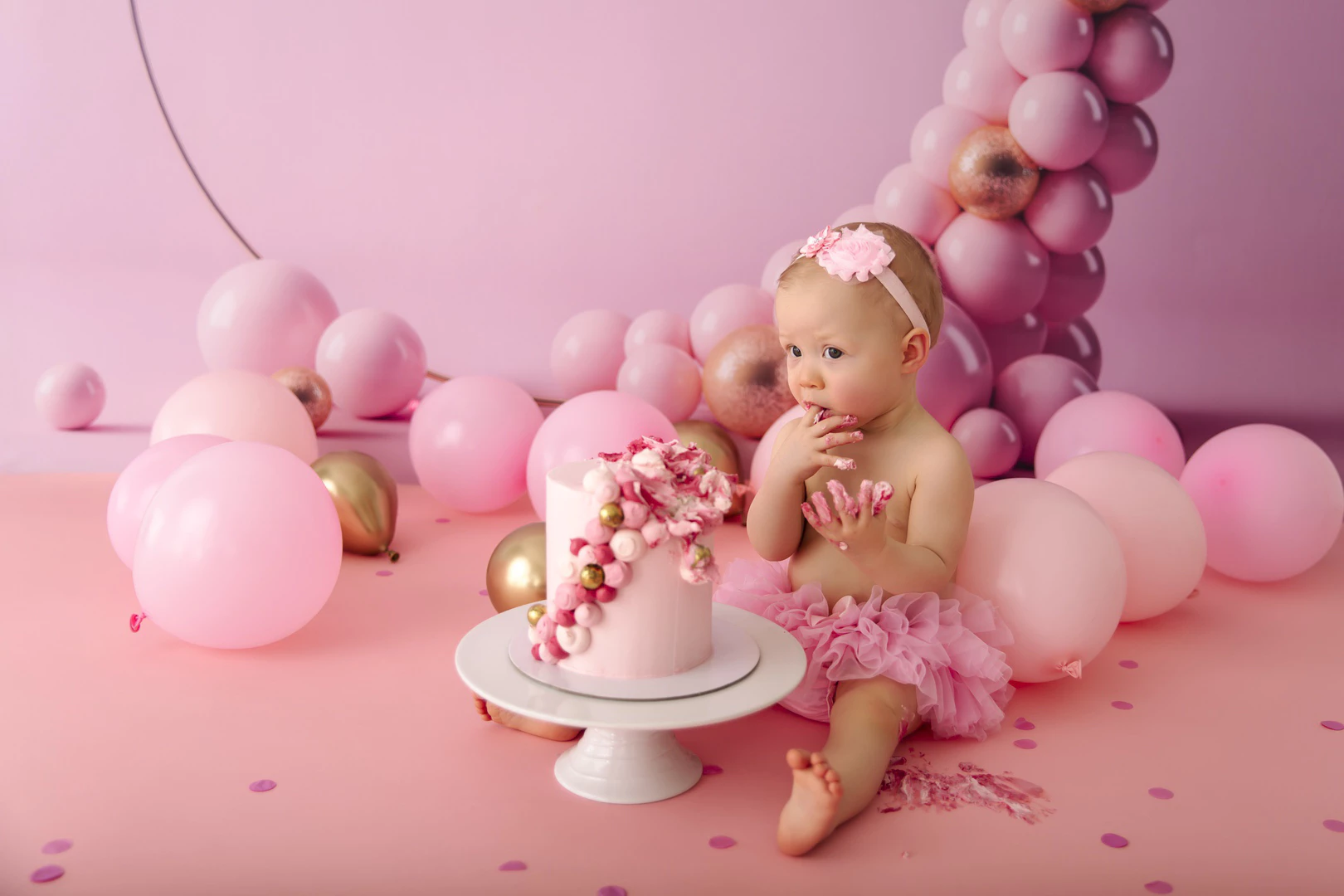 Our Cake Smash Photography Sessions take place at our beautiful North Lakes Studio. We style these sessions with one of our beautiful professional backdrops (we have 15 to choose from) and professionally made 5 inch cake.