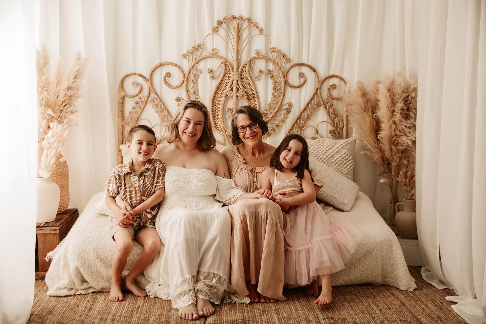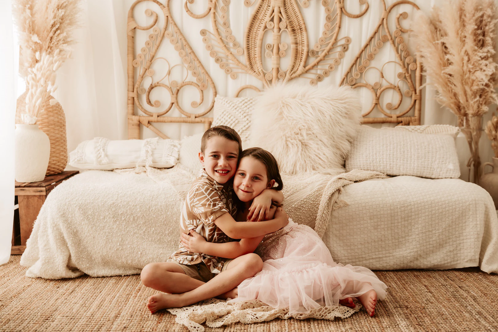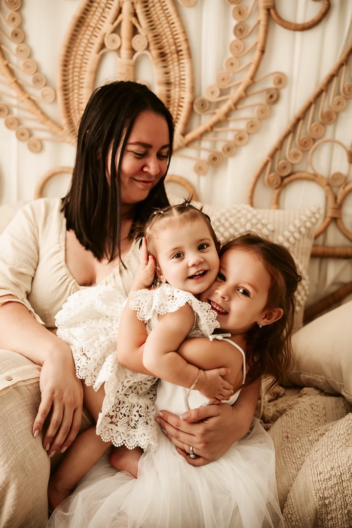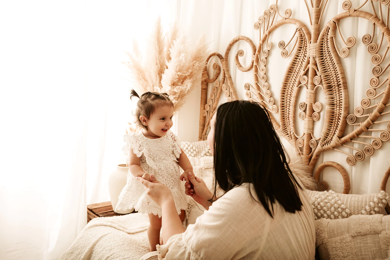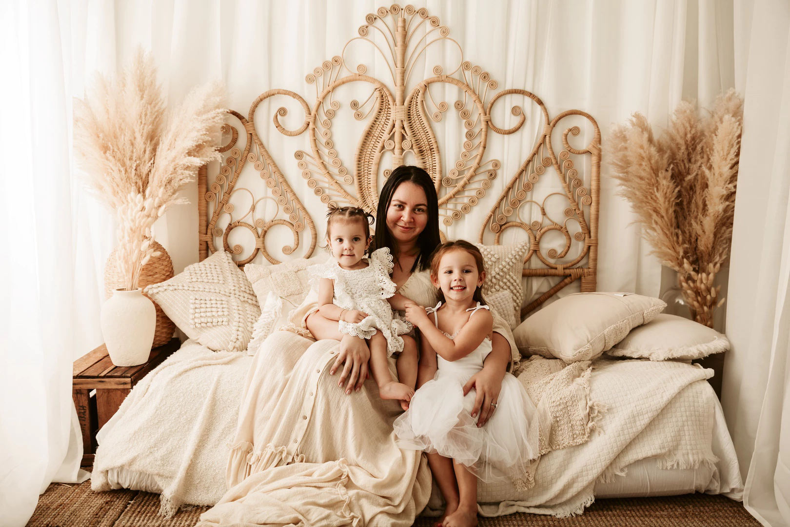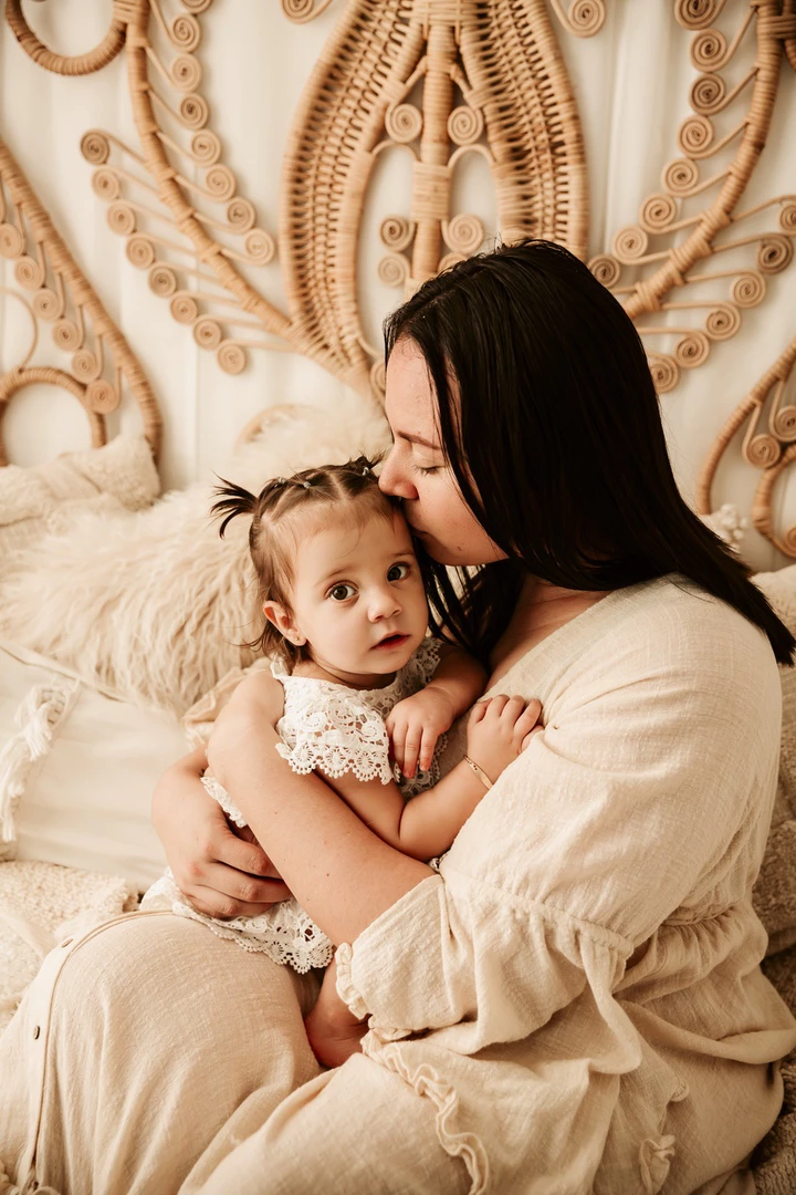Welcome to Boho Minis, where comfort meets charm! Dive into a world of soft textures with our cozy blankets and pillows. Adorned with dried pampas grass and bunny tails, our space is bathed in soft white light filtering through sheer curtains, framed by a delightful rattan bedhead. Available year-round, perfect for timeless family photos—no weather woes here! The most perfect gift for Mothers Day – we can provide you with a beautiful physical Gift Certificate to give your wonderful Mum / Partner on the day.